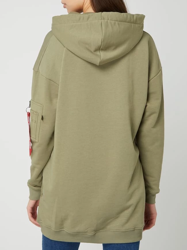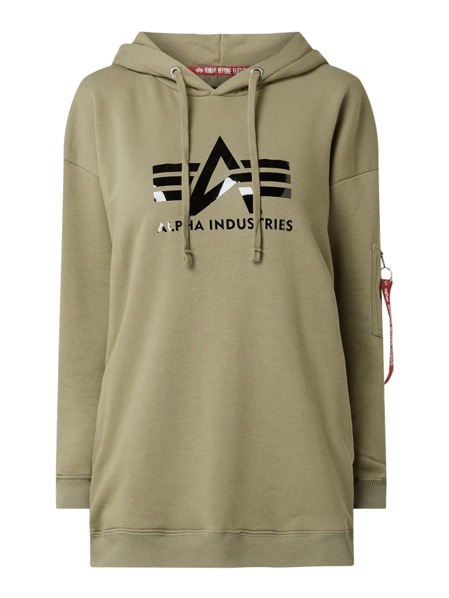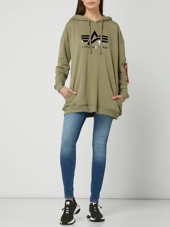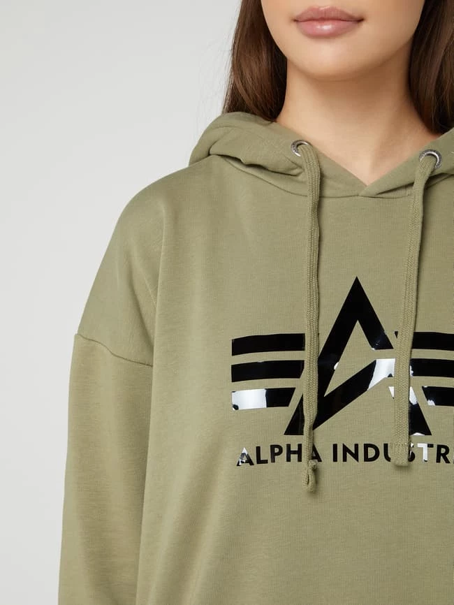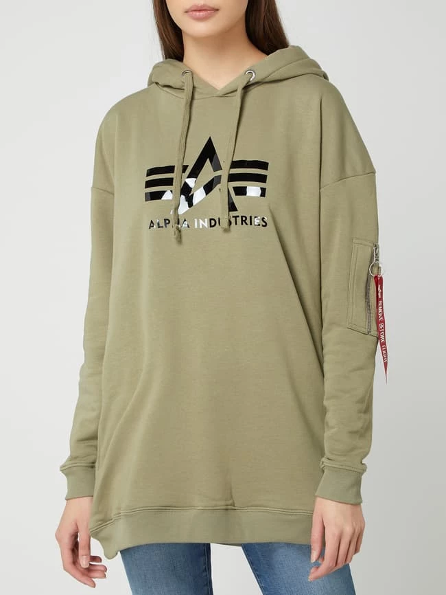 Der Hoodie von Alpha Industries ist aus einer Baumwollmischung gefertigt und kommt im Oversized Look. Er zeigt sich mit überschnittenen Schultern, Logo-Print und Reißverschlusstasche.