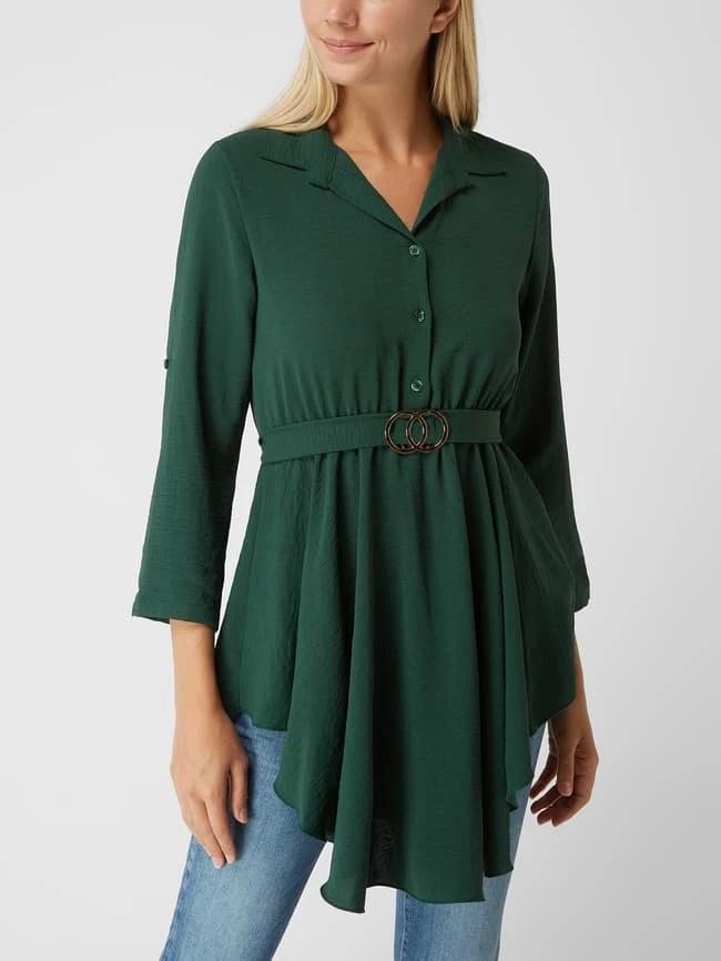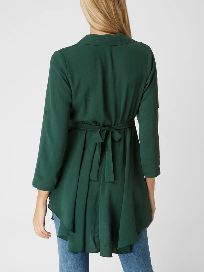 Das Kleid von Apricot ist aus leichtem Material gefertigt und tailliert geschnitten. Es kommt mit Reverskragen, 3/4-Arm in regulierbarer Länge und fixiertem Taillengürtel zum Binden.
