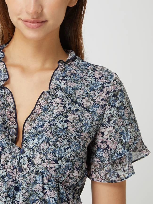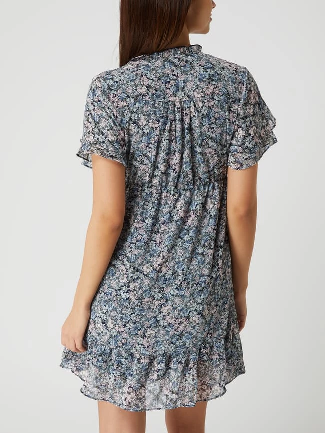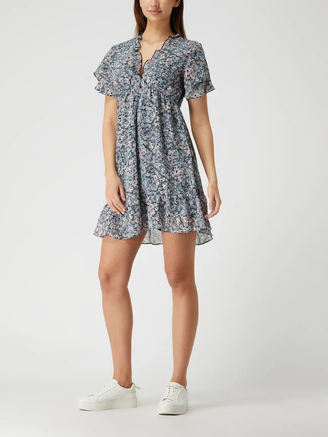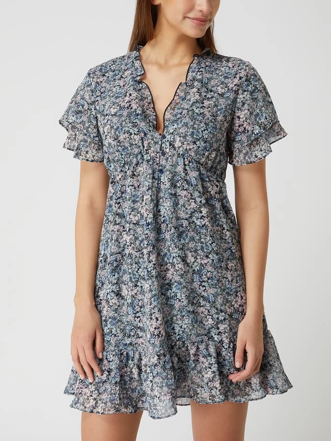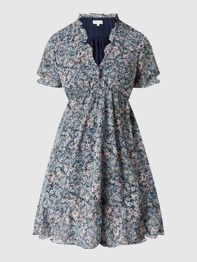 Das Kleid von Apricot ist aus Chiffon gefertigt und tailliert geschnitten. Es zeigt sich mit Millefleurs, Rüschen und kurzen Volantärmeln.