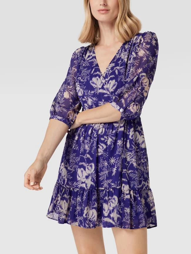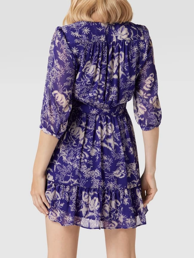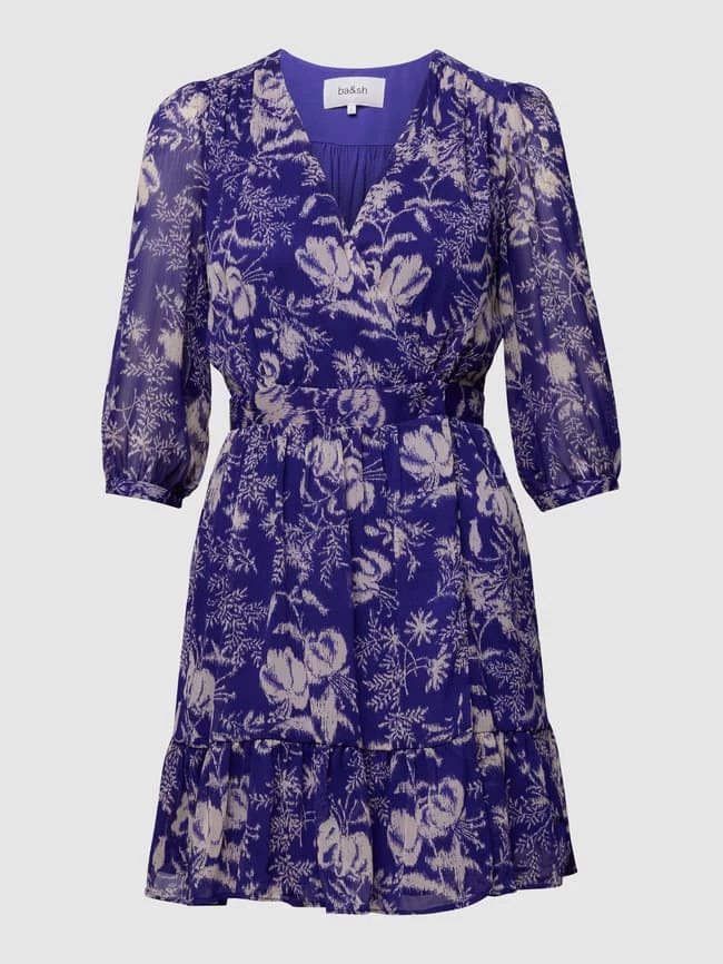 Das Minikleid von ba&sh ist aus strapazierfähigem Material gefertigt und tailliert geschnitten. Es zeigt sich in Wickel-Optik mit V-Ausschnitt und Allover-Muster sowie Volantsaum.