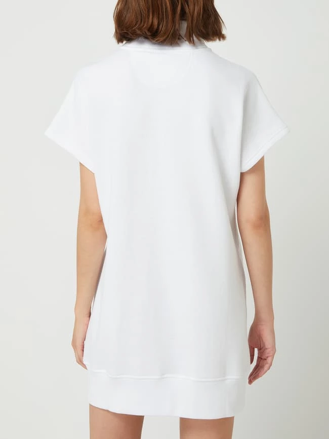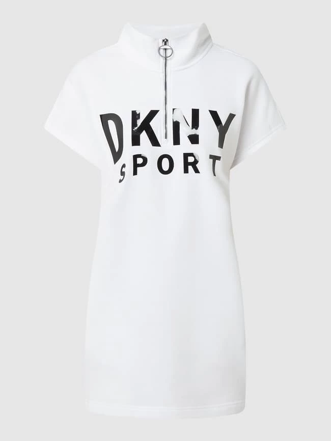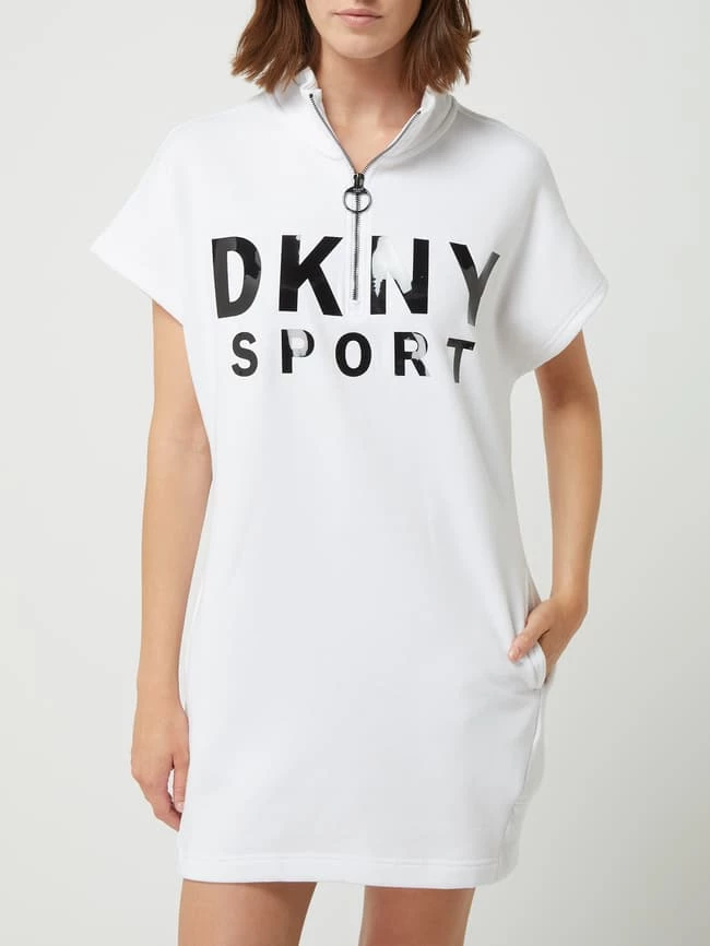 Das Sweatkleid von DKNY PERFORMANCE ist aus einer Baumwollmischung gefertigt. Es zeigt sich in taillierter Passform mit Stehkragen, Reißverschluss und glänzendem Logo-Print.