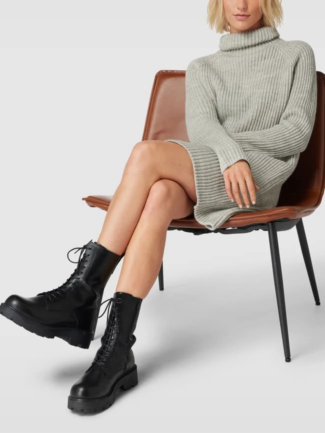 Das Strickkleid von DRYKORN ist aus einem strapazierfähigen Material-Mix mit Woll-Anteil gefertigt und im lockeren Schnitt gehalten. Es zeigt sich in unifarbenem Design und Ripp-Optik sowie mit Stehkragen.