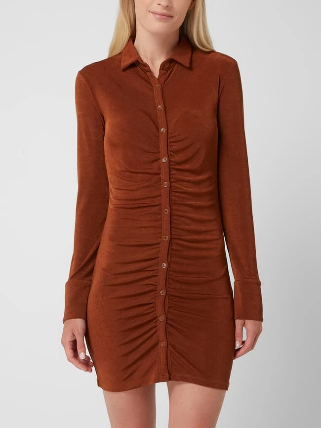 Das Blusenkleid von Gina Tricot ist aus einer Materialmischung mit Stretch-Anteil gefertigt. Es kommt in eng anliegender Passform mit Umlegekragen, Knopfleiste und feinen Raffungen.