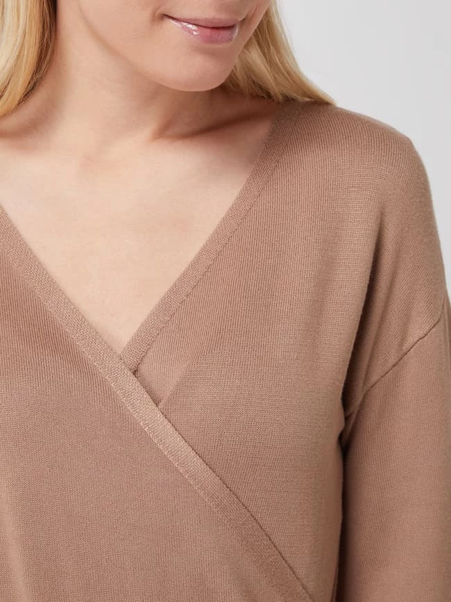 Das Strickkleid von GUESS ist aus einer Viskosemischung gefertigt und eng anliegend geschnitten. Es kommt in Wickel-Optik mit V-Ausschnitt, überschnittenen Schultern und abgesetztem Rockteil.