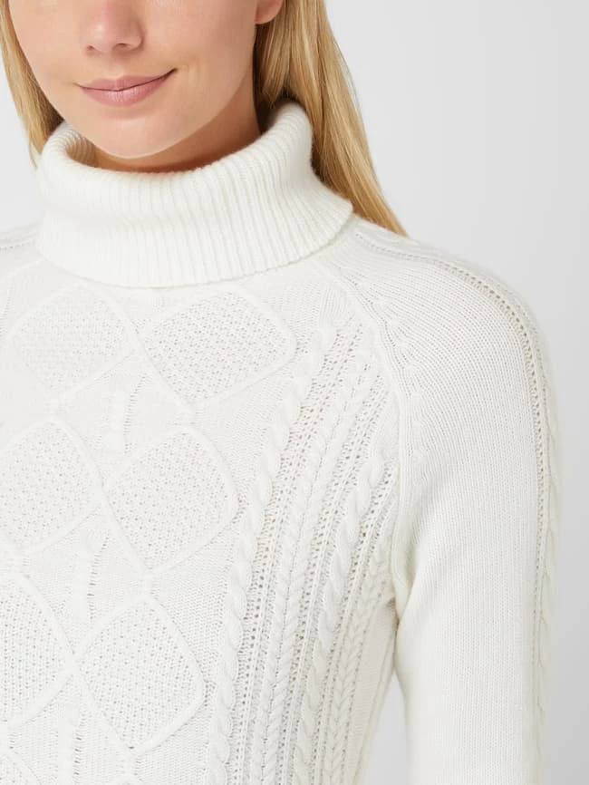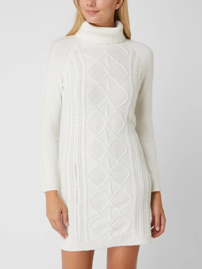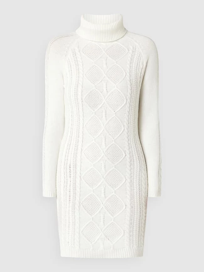 Das Strickkleid von GUESS ist aus einer Materialmischung mit Woll-Anteil gefertigt. Es zeigt sich in eng anliegender Passform mit Zopfmuster und Rollkragen.