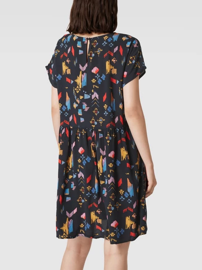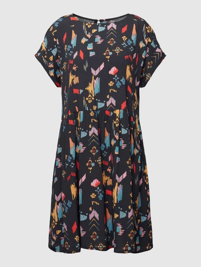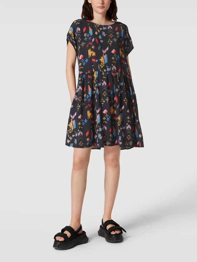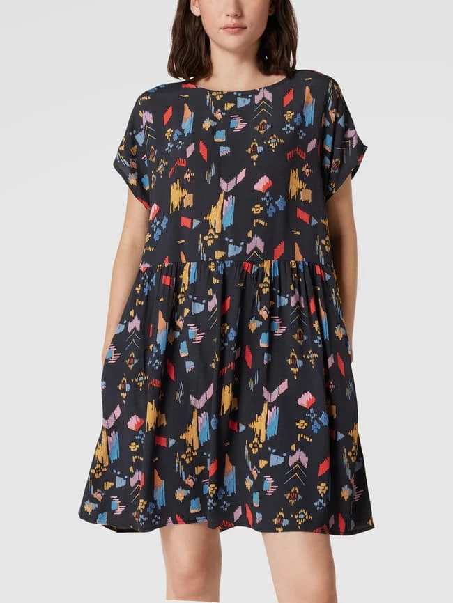 Das Minikleid von Jake*s Casual ist aus reiner Viskose gefertigt und locker geschnitten. Es zeigt sich mit Allover-Muster, U-Boot-Ausschnitt und Raffungen an der Taille.