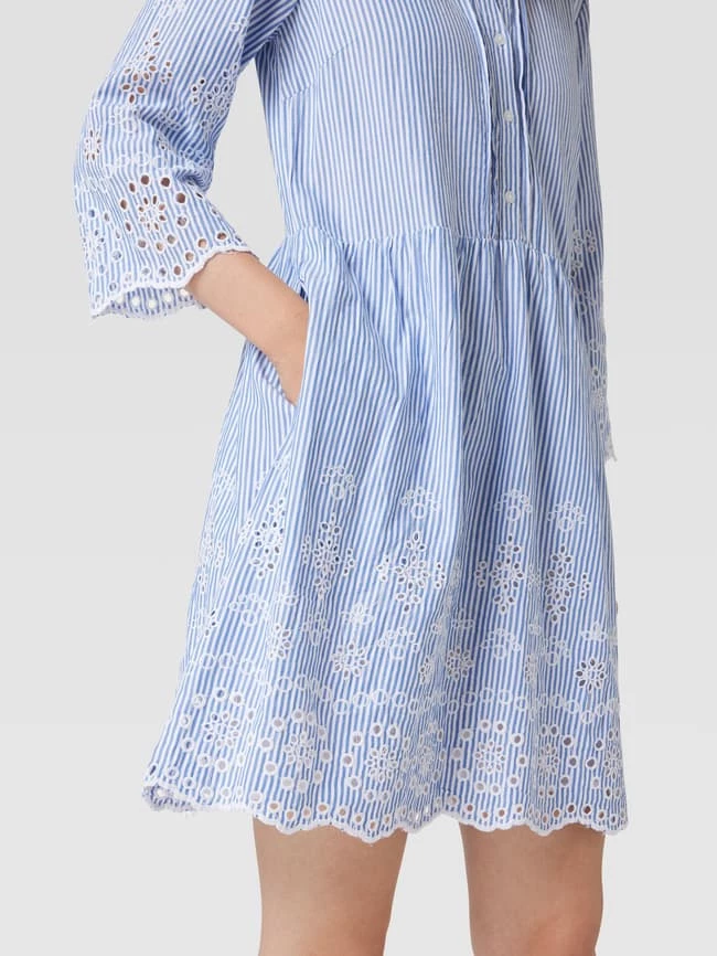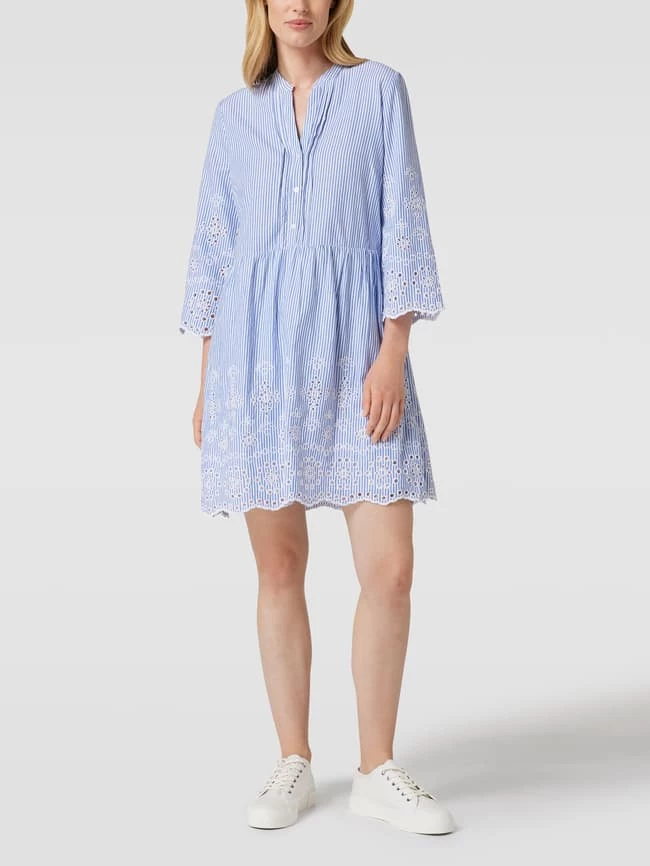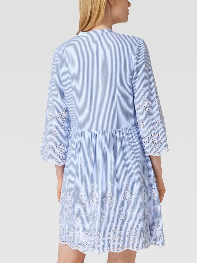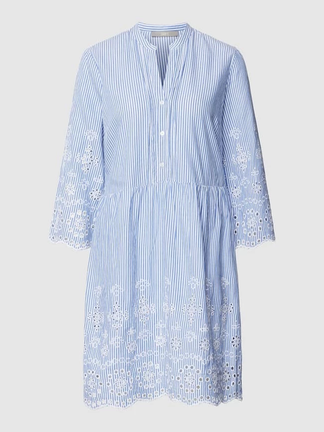 Das Minikleid von Jake*s Collection ist aus reiner Baumwolle gefertigt und locker geschnitten. Es kommt mit Streifenmuster, V-Ausschnitt, kurzer Knopfleiste und floraler Stickerei.
