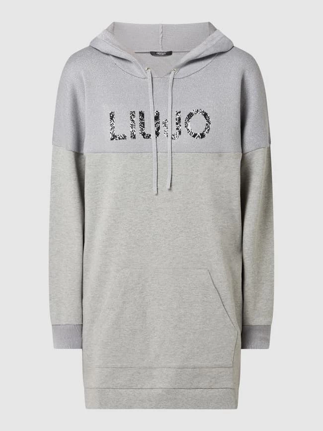 Das Sweatkleid von Liu Jo ist aus einem Baumwoll-Elasthan-Mix gefertigt und leicht ausgestellt geschnitten. Es kommt mit Kontrasteinsatz, Känguru-Tasche und Strasssteinen.