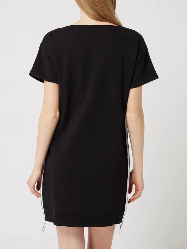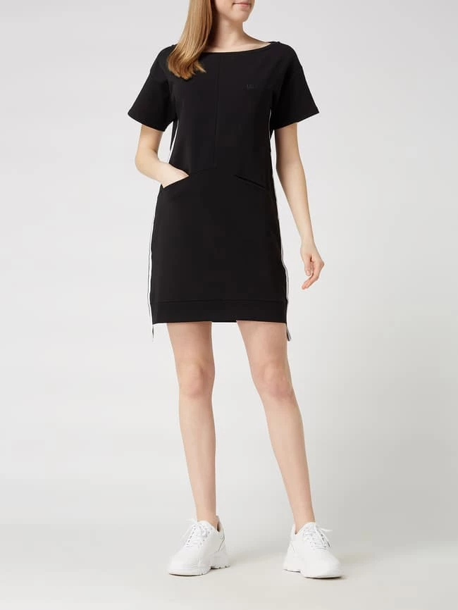 Das Sweatkleid von Liu Jo ist aus einem Baumwoll-Elasthan-Mix gefertigt und eng anliegend geschnitten. Es kommt mit Rundhalsausschnitt, kurzen Ärmeln und Eingrifftaschen.