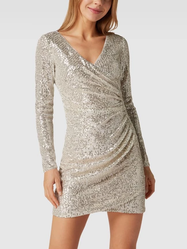 Das Cocktailkleid von Paradi ist aus einem elastischen Material-Mix gefertigt und eng anliegend geschnitten. Es kommt in Wickel-Optik mit Paillettenbesatz, V-Ausschnitt und Raffungen.
