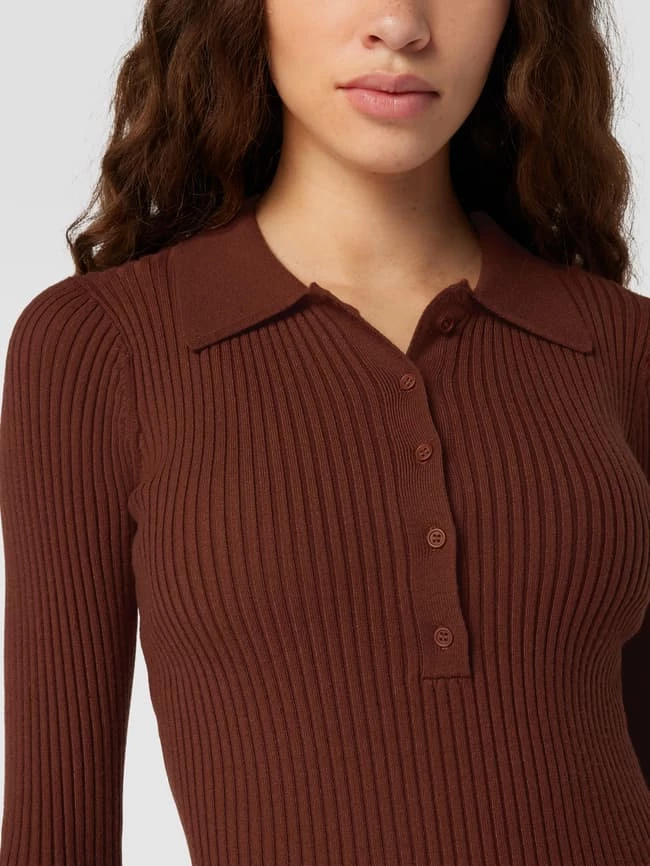 Das Strickkleid von REVIEW ist aus einem Viskose-Mix gefertigt und eng anliegend geschnitten. Es zeigt sich mit geripptem Umlegekragen und kurzer Knopfleiste.