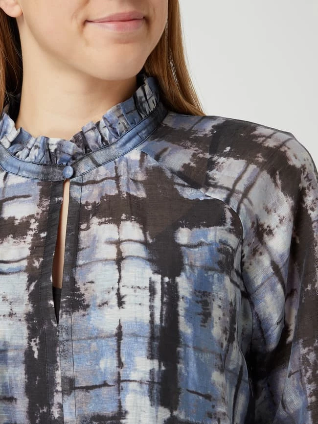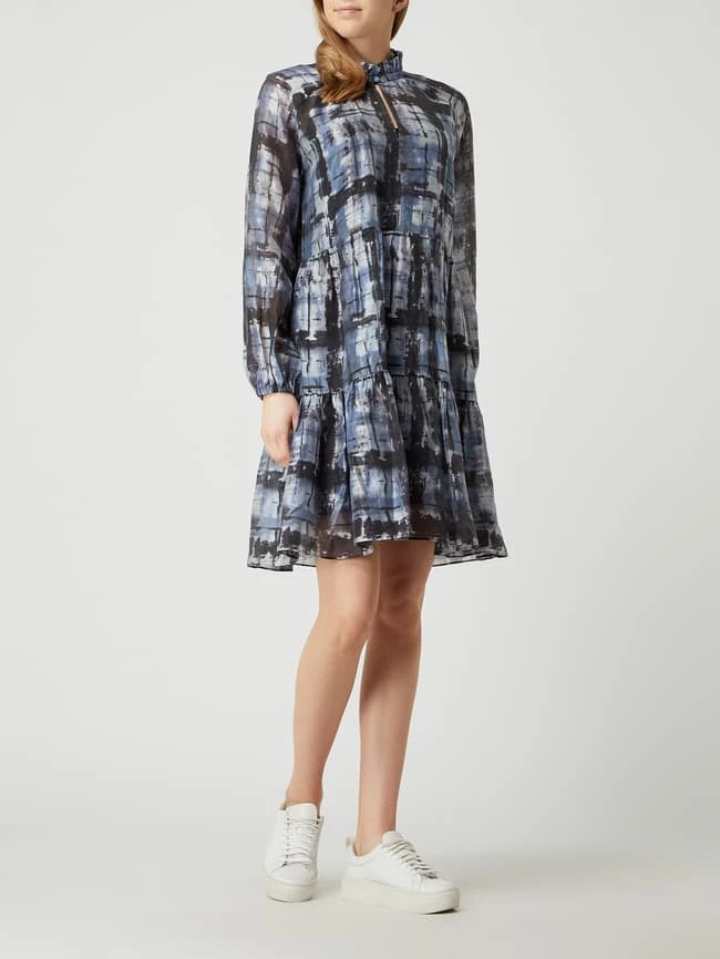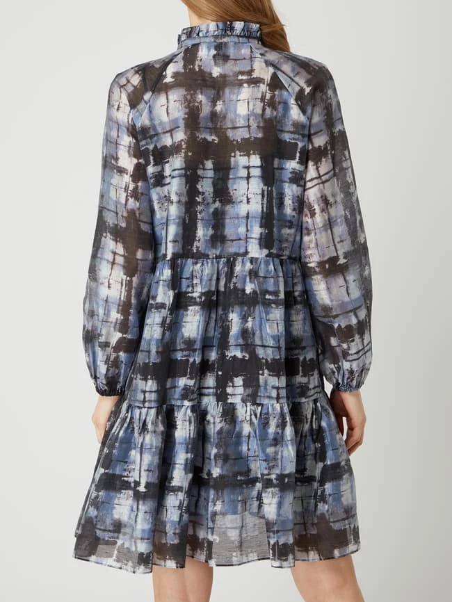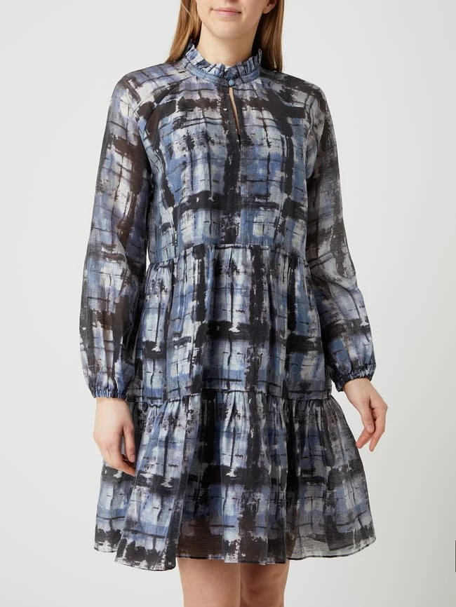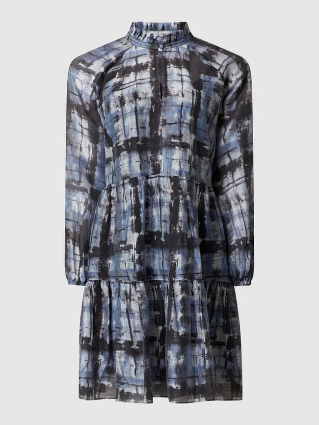 Das Kleid von Second Female ist aus einer Lyocellmischung mit Leinen-Anteil gefertigt. Es kommt in ausgestellter Passform mit Allover-Muster, gerüschtem Stehkragen und elastischen Ärmelabschlüssen.