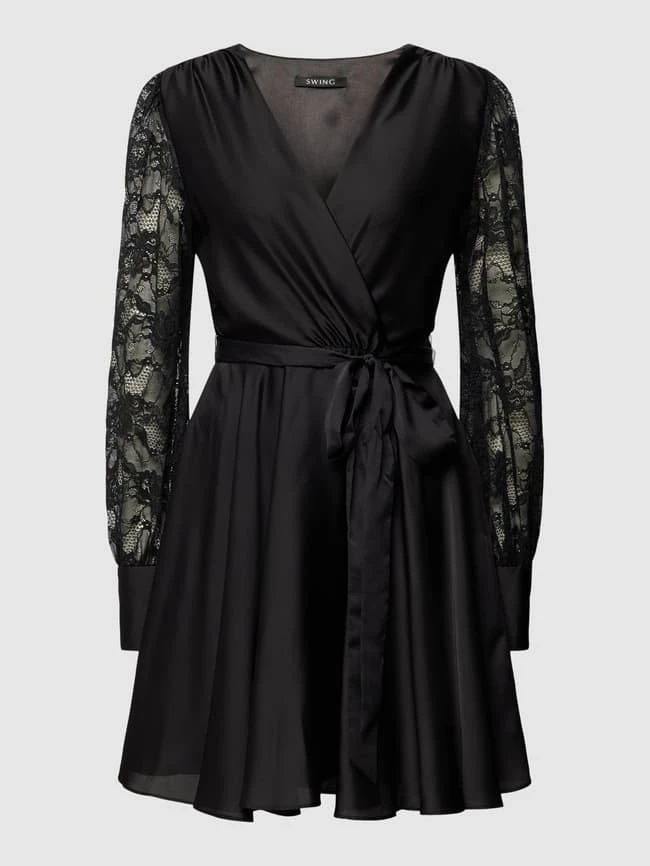 Das knielange Kleid von SWING ist aus einem strapazierfähigen Material gefertigt und im taillierten Schnitt gehalten. Es zeigt sich in unifarbenem Design mit V-Ausschnitt und Taillengürtel.